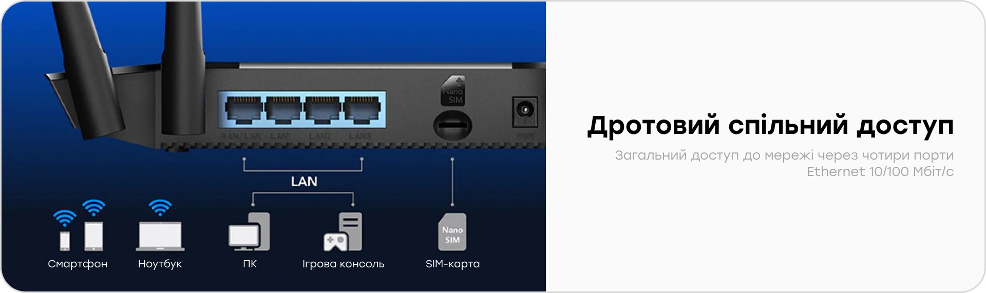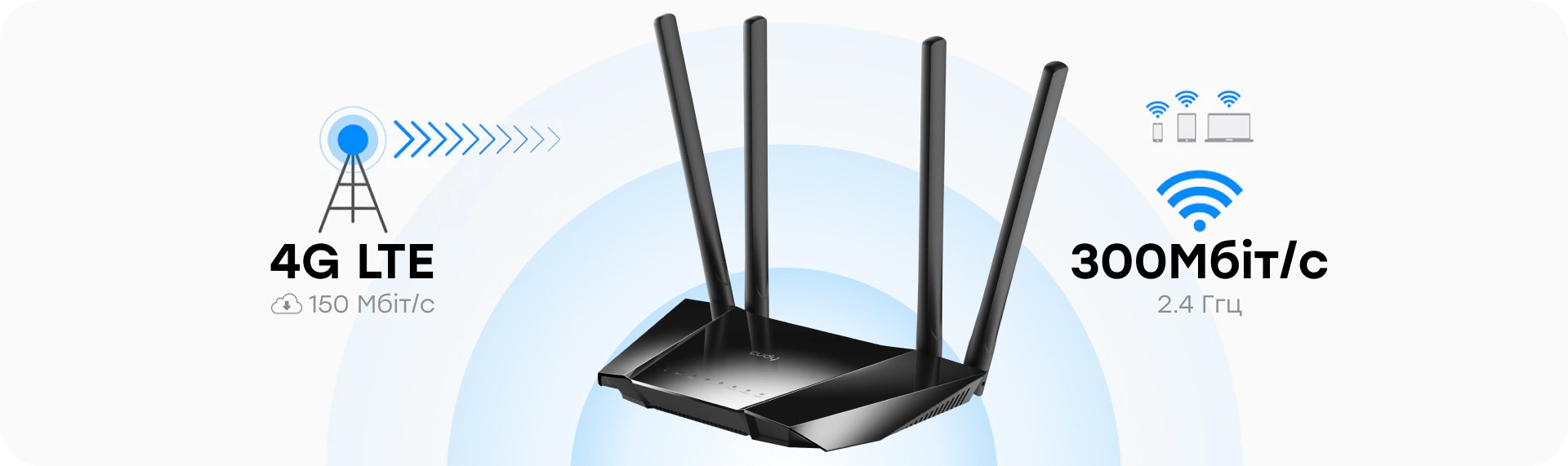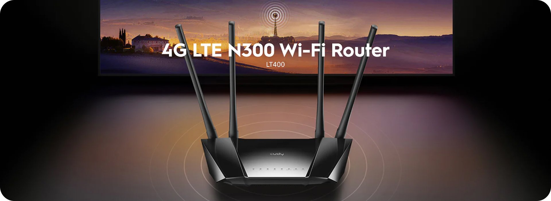 WiFi Mesh 4G LTE маршрутизатор Cudy LT400. Встроенный LTE-модем со скоростью загрузки/отдачи 150/50 Мбит/с, скорость передачи через WiFi 300 Мбит/с на 2.4 ГГц, стандарт WiFi 802.11/a/b/g/n, 1 порт 10/100 Мбит/с WAN/ LAN, 3 порта 10/100 Мбит/с LAN, слот под Nano-SIM карту, 2 внешних фиксированных WiFi-антенны и 2 внешних фиксированных LTE-антенны.